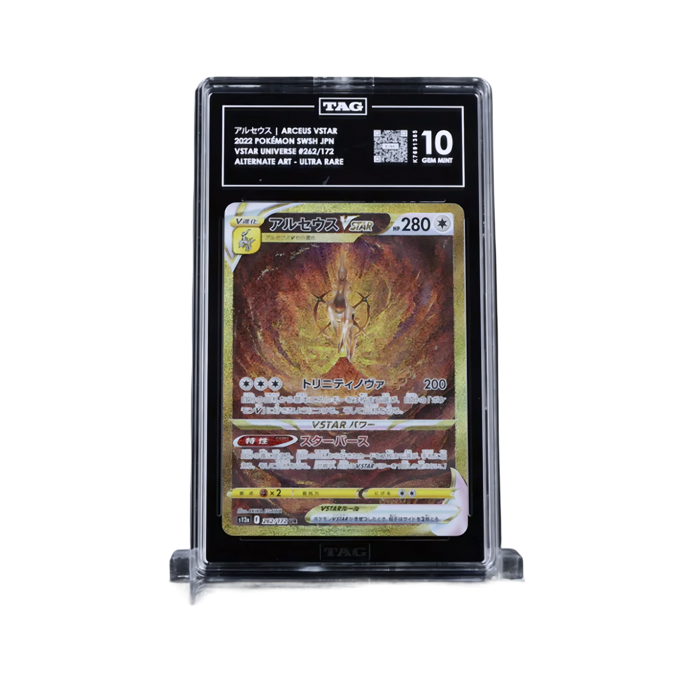 Arceus VSTAR 262/172 from the 2022 Japanese VSTAR Universe expansion is an Alternate Art Ultra Rare that captured attention the moment the set released. This listing is for a card graded TAG 10 (Gem Mint), the highest grade TAG assigns — indicating a flawless card with perfect centering, pristine surface, sharp corners, and no visible handling marks. Encased in TAG’s tamper-proof slab, this Arceus VSTAR is a top-tier collectible for serious Pokémon TCG collectors, investors, and fans of the Arceus line.