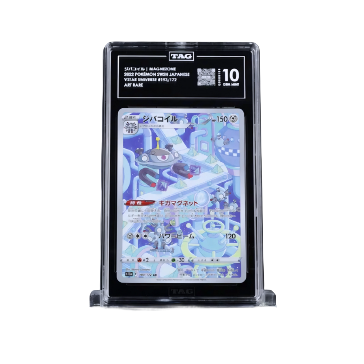 The Magnezone Art Rare (#193/172) from the Japanese VSTAR Universe expansion is a striking collectible card showcasing the fan-favorite Electric/Steel-type Pokémon in a vivid full-art style. This particular card has been professionally graded TAG 10, certifying it as Gem Mint, the highest grade achievable. Collectors can be confident they’re holding a flawless piece of modern Pokémon history, encased in TAG’s crystal-clear protective slab for authenticity and long-term preservation.